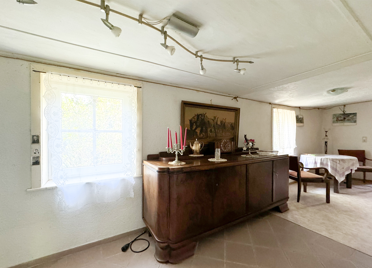 Terrasse, geschlossene Veranda, Einbauküche, gefliestes Tageslichtbad m.Wanne, Kachelofen, Elektrospeicherofen, Warmwasser über Strom, Isolierglasfenster (2018), Einfachfenster-Holz, Fussboden gefliest, einf.Holzböden, PVC-Belag, Vorratsraum, Dachboden, Bio-Kläranlage (2004), öffentl. Trinkwassernetz, Telefonanschluss, Brunnen, Garten, Nebengelass, Scheune